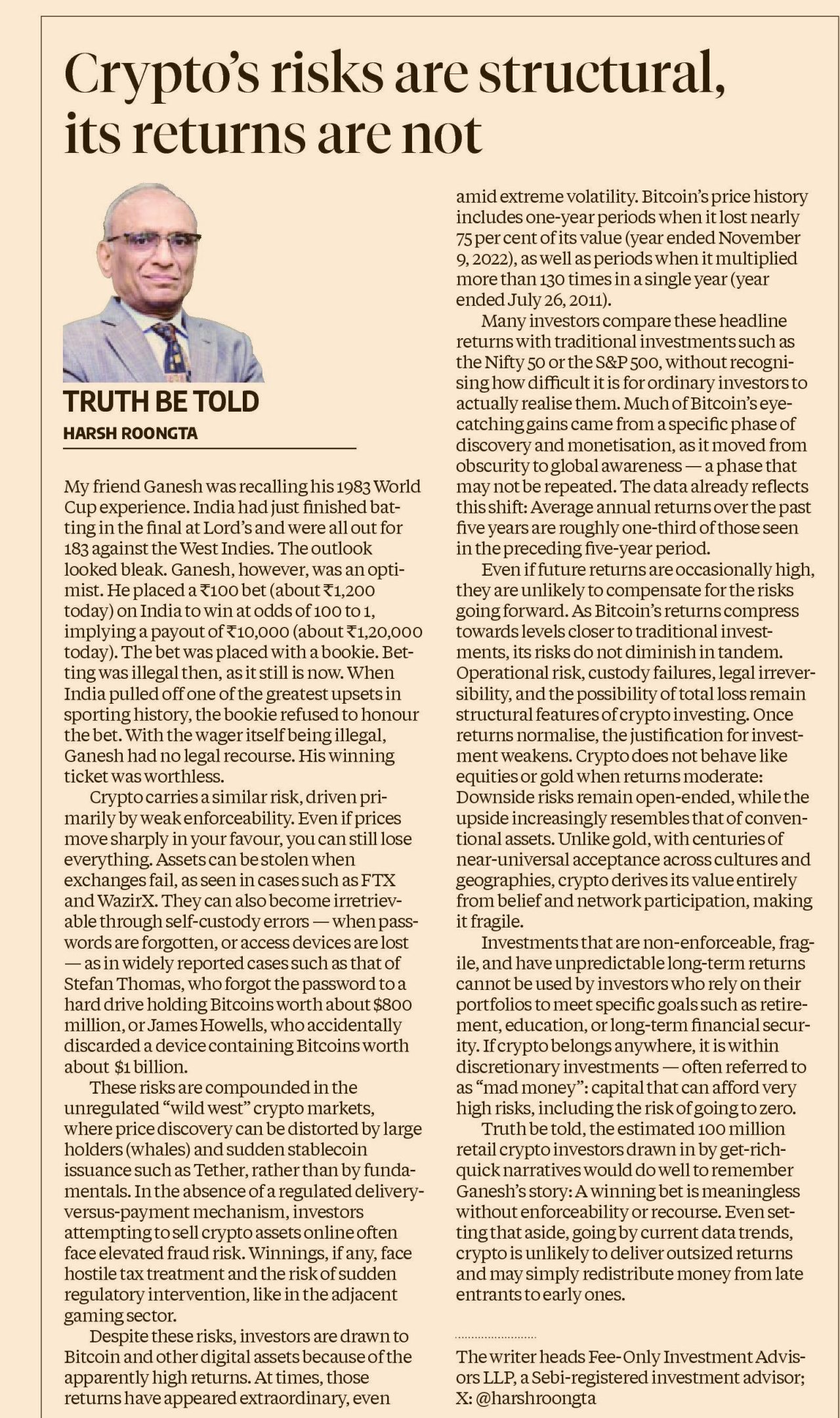 Truth be told, the estimated 10 crore retail crypto investors drawn in by get-rich-quick narratives would do well to remember Ganesh’s story: a winning bet is meaningless without enforceability or recourse. Going by current data trends, crypto is unlikely to deliver outsized returns and may simply redistribute money from late entrants to early ones. For investors with real financial goals, crypto belongs at most in the realm of speculation—not as a substitute for regulated investments such as mutual funds.