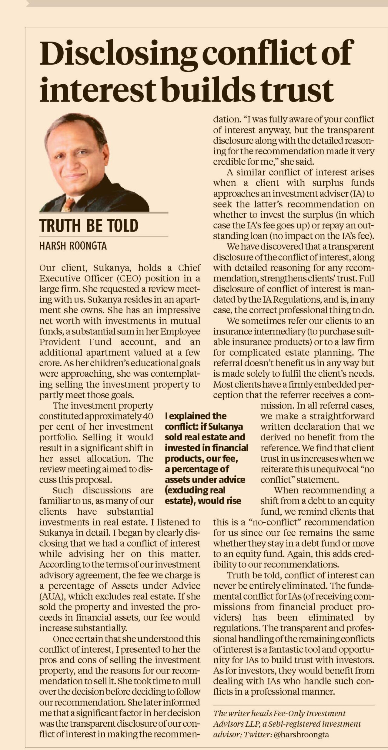Such discussions are familiar to us, as many of our clients have substantial investments in real estate. I listened to Sukanya in detail. I began by clearly disclosing that we had a conflict of interest while advising her on this matter. According to the terms of our investment advisory agreement, the fee we charge is a percentage of Assets under Advice (AUA), which excludes real estate. If she sold the property and invested the proceeds in financial assets, our fee would increase substantially.