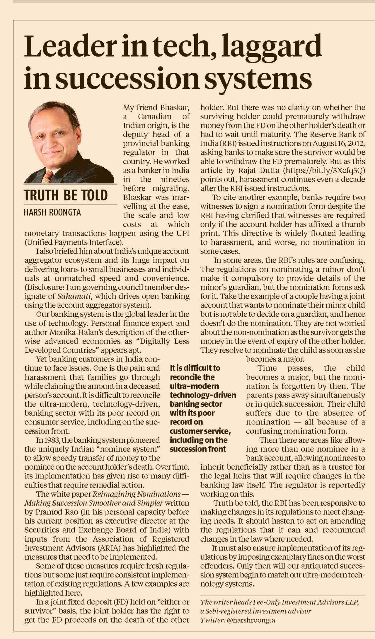 In 1983, the banking system pioneered the uniquely Indian “nominee system” to allow speedy transfer of money to the nominee on the account holder’s death. Over time, its implementation has given rise to many difficulties that require remedial action.