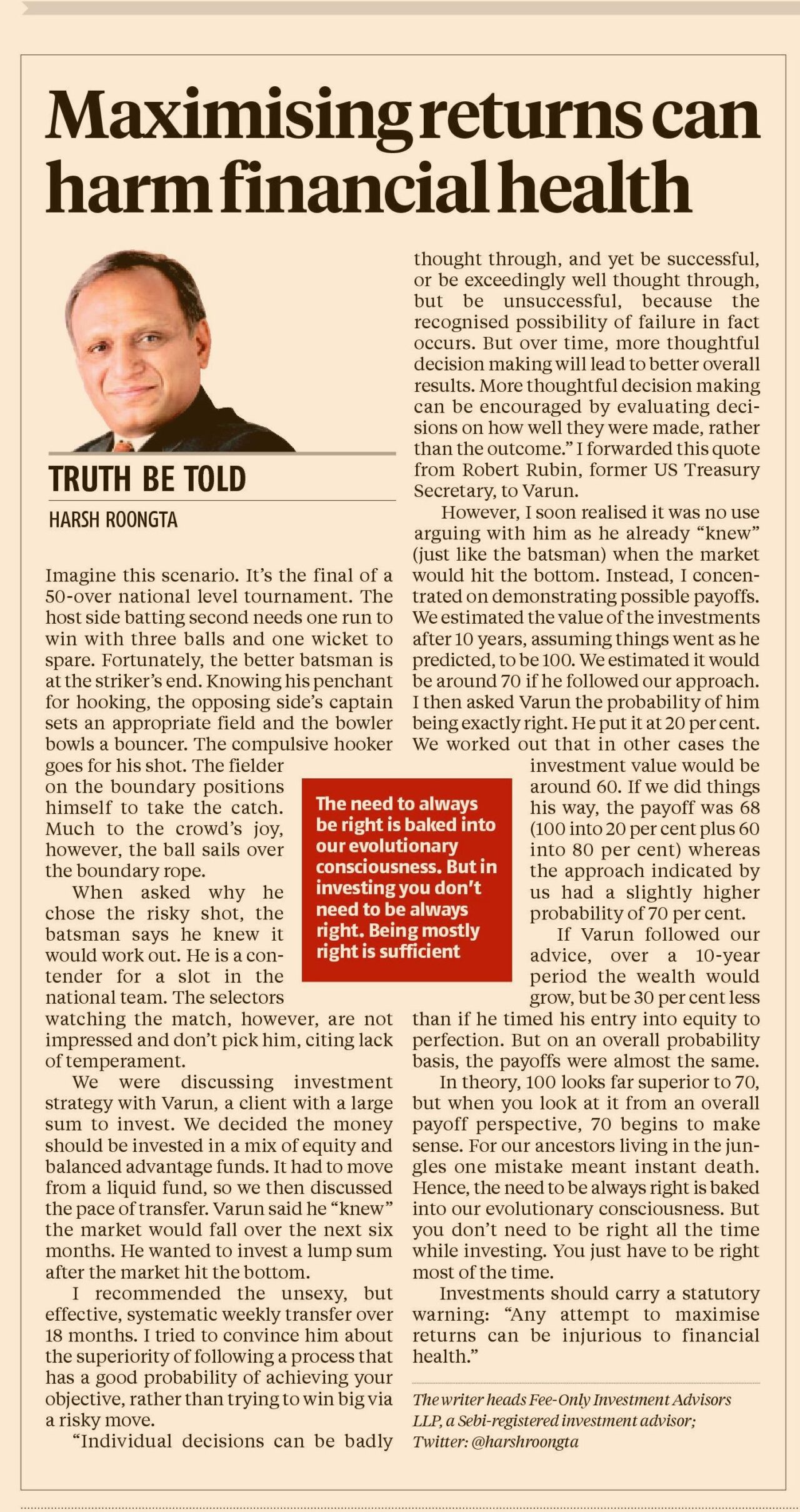 “Individual decisions can be badly thought through, and yet be successful, or be exceedingly well thought through, but be unsuccessful, because the recognised possibility of failure in fact occurs. But over time, more thoughtful decision making will lead to better overall results. More thoughtful decision making can be encouraged by evaluating decisions on how well they were made, rather than the outcome.” I forwarded this quote from Robert Rubin, former US Treasury Secretary, to Varun.